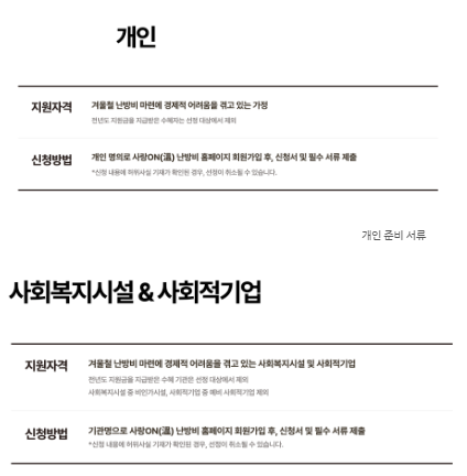 - 기존 저소득 가구 중심 지원에서 벗어나 지원 대상을 *개인 가정 전체(난방비 부담 가구)*로 확대하고, 시설 및 기업까지 포괄하도록 변경되었습니다.