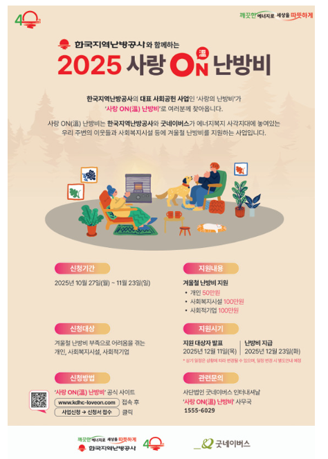 한국지역난방공사가 굿네이버스와 함께 운영하는 에너지 복지 지원사업입니다. 기존 ‘사랑의 난방비’ 프로그램이 새 이름으로 바뀐 형태로, 겨울철 난방비 부담이 큰 가정 및 사회복지시설, 사회적기업 등을 대상으로 난방비를 지원합니다.